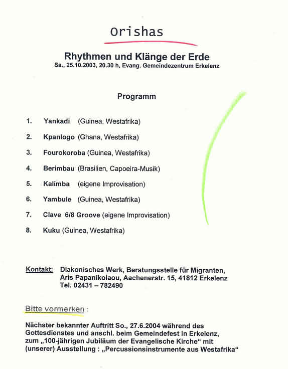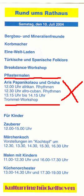 [Home] [Kurse, Termine ...] [Tipps & Tricks] [Shopping] [Aris Papanikolaou] [Sarakina 2003] [Sarakina 2004] [Essen und Trinken] [Foto-Archiv] [Auftritte] [ORISHAS] [Djembe-Fest ´03-I] [Djembe-Fest ´03-II] [Instrumentenbau] [Links] [Kontakt & Impressum]